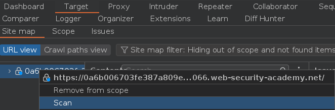 El segundo paso es identificar y evaluar entradas unkeyed, para ello vamos primero a crawlear la web con Burpsuite y a navegar manualmente por ella. Para hacer esto nos dirigimos a Target > Site map > Click derecho sobre el dominio > Scan