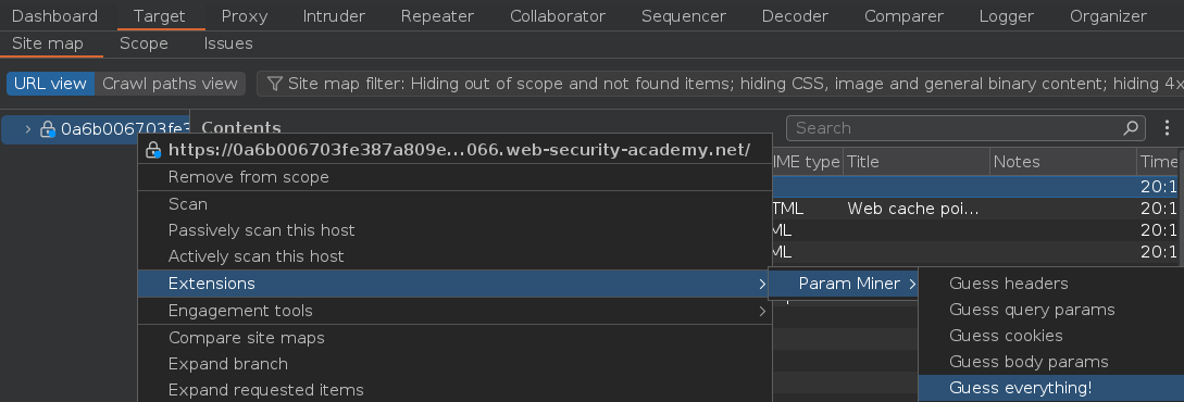 Una vez haya terminado el escaneo, vamos a usar la extensión Param miner para identificar entradas unkeyed. Debemos hacer click derecho sobre el dominio > Extensions > Param Miner > Guess everything!