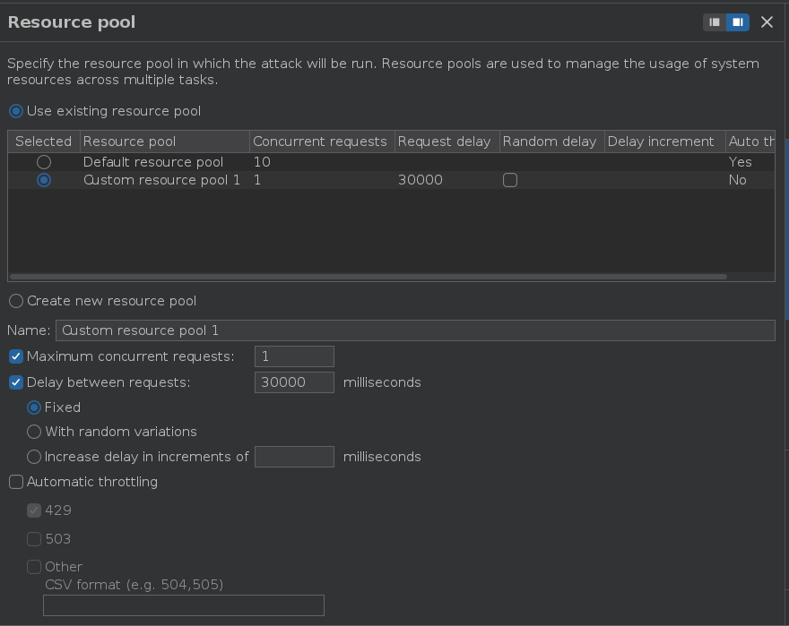 En la parte de Resource pool, tenemos que crear una pool que tenga un delay de 35 segundos entre peticiones y que se mande solamente 1 petición a la vez. Si queremos asegurarnos de que siempre está activo podemos poner un valor más bajo, 25 o 30 segundos por ejemplo