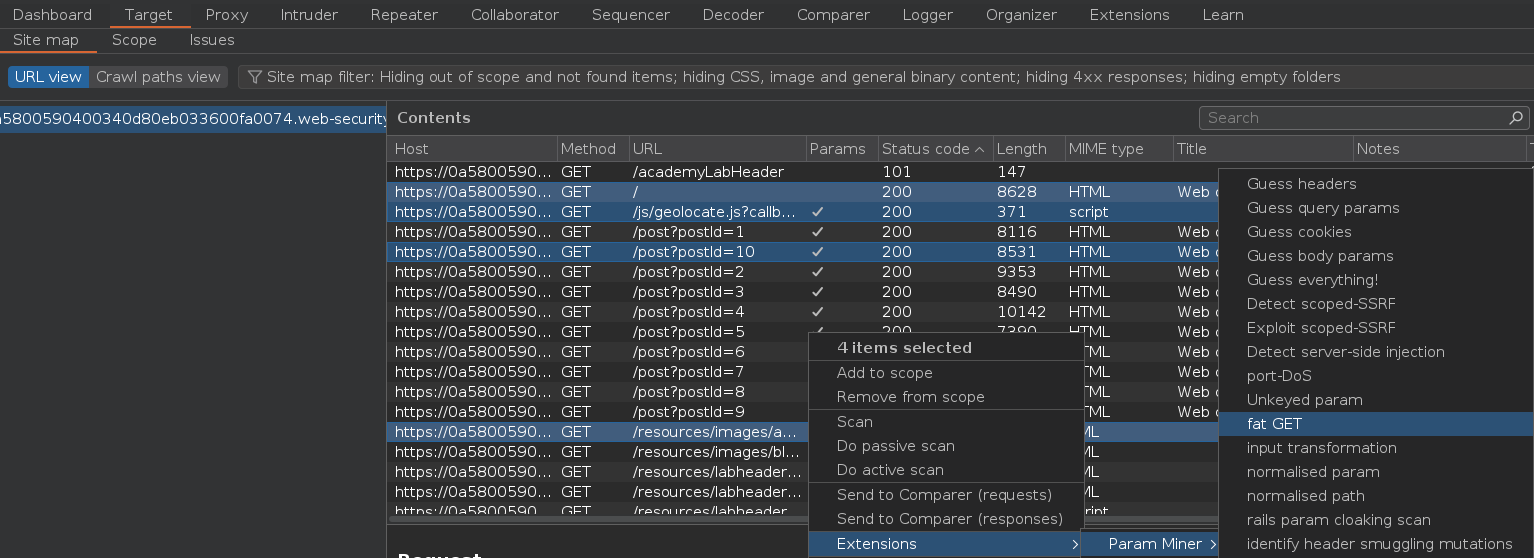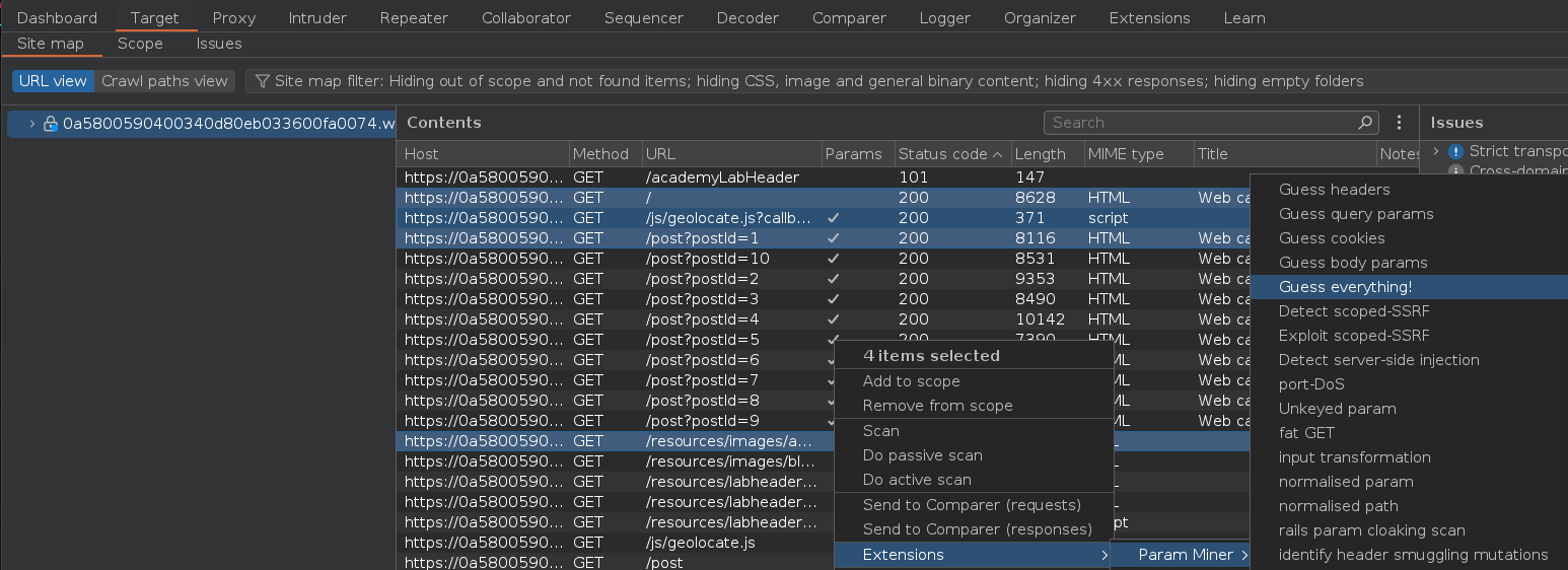 Una vez haya terminado el escaneo, vamos a usar la extensión Param miner para identificar entradas unkeyed. Debemos hacer click derecho sobre el dominio > Extensions > Param Miner > Guess everything!