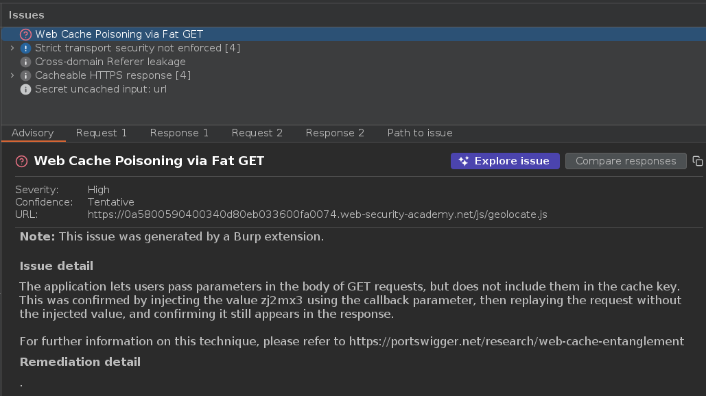 Web cache poisoning via a fat GET request