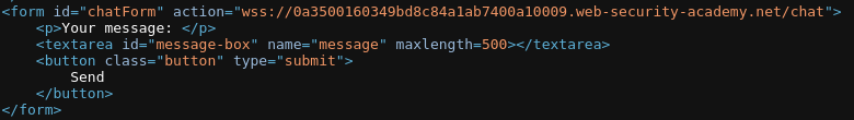 var ws = new WebSocket('wss://0a3500160349bd8c84a1ab7400a10009.web-security-academy.net/chat');