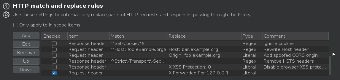 En la pestaña de Scope marcamos la casilla Proxy (use with caution) y seleccionamos Include all URLs