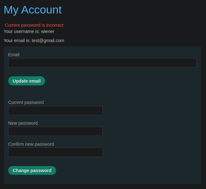 Si hacemos lo mismo pero la contraseña es incorrecta y los otros dos campos coindicen nos devuelve un código de estado 302 Found y nos desloguea en todas las ocasiones, por lo tanto esta forma no la podemos usar para bruteforcear la contraseña. Sin embargo, si ponemos en el campo Current password una contraseña incorrecta y New password y Confirm new password no coinciden nos arroja el mensaje Current password is incorrect