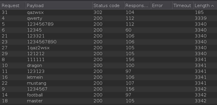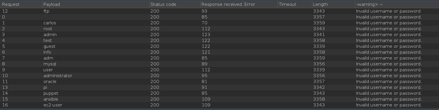Ejecutamos el ataque de fuerza bruta y ordenamos la columna de la expresión regular que hemos creado. Una vez hecho eso vemos que para el usuario ftp no devuelve exactamente la misma expresión que las demás, por lo tanto podríamos considerar ftp como un usuario válido