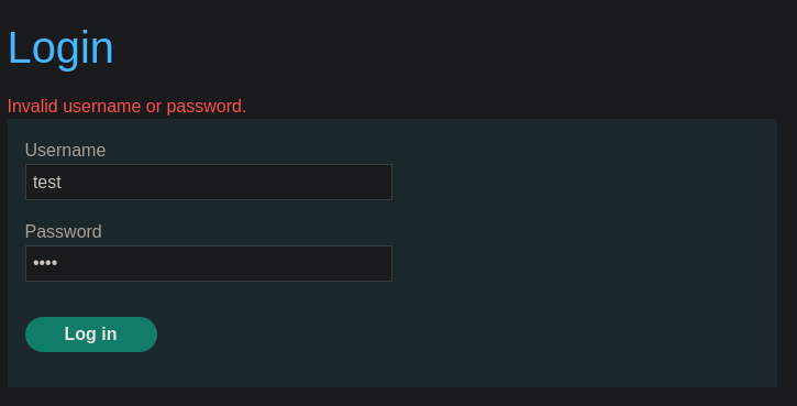 Pulsamos sobre My account, introducimos un usuario y contraseña aleatorios y vemos que el servidor nos devuelve Invalid username or password.