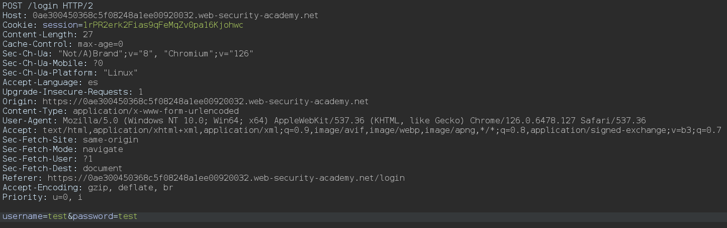 Este laboratorio es vulnerable a ataques de enumeración de nombres de usuario y fuerza bruta de contraseñas. Tiene una cuenta con un nombre de usuario y contraseña predecibles, que se pueden encontrar en los diccionarios Candidate usernames https://portswigger.net/web-security/authentication/auth-lab-usernames y Candidate passwords https://portswigger.net/web-security/authentication/auth-lab-passwords. Para resolver el laboratorio, debemos enumerar un nombre de usuario válido, realizar un ataque de fuerza bruta para descubrir la contraseña de este usuario y acceder a su página de cuenta