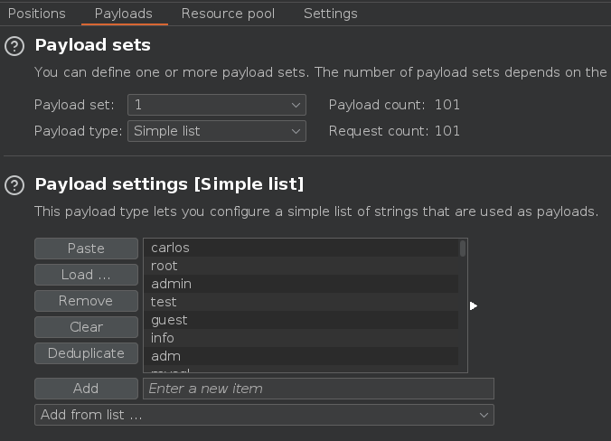 Nos dirigimos al apartado de Payloads y pegamos el contenido del diccionario Candidate usernames https://portswigger.net/web-security/authentication/auth-lab-usernames