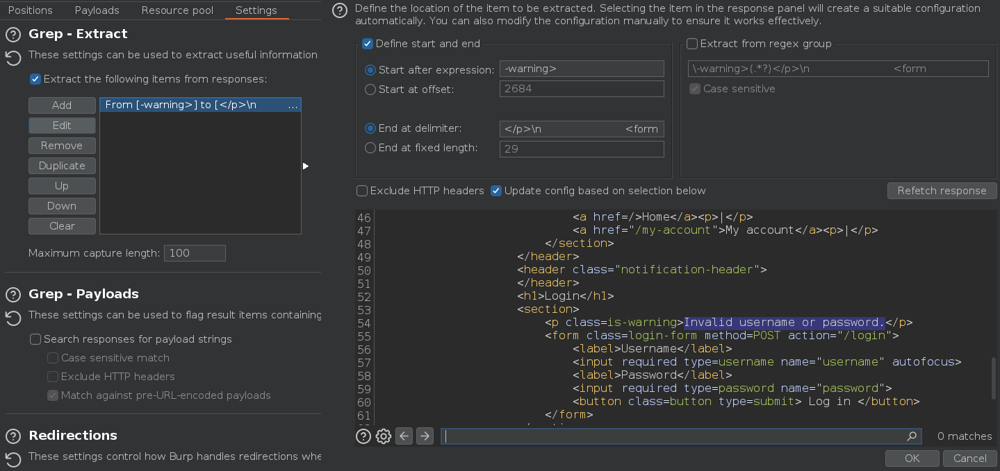 En el apartado de Settings > Grep - Extract tenemos que marcar el texto Invalid username or password. para que si se produce algún cambio en ese apartado nos lo represente