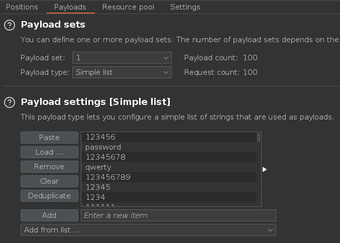 En la pestaña Payload pegamos el contenido del diccionario Candidate passwords https://portswigger.net/web-security/authentication/auth-lab-passwords