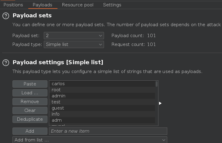 Configuramos el segundo payload, para el cual vamos a usar a los usuarios del diccionario Candidate usernames https://portswigger.net/web-security/authentication/auth-lab-usernames
