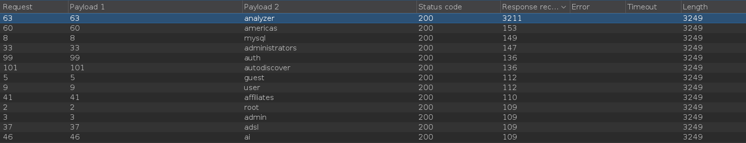Al ejecutar el ataque nos damos cuenta que si enviamos como payload al analyzer el servidor tarda mucho más tiempo en devolver una respuesta que los demás, lo cual quiere decir que este usuario existe