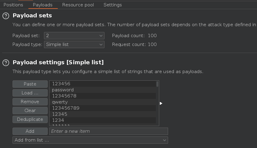Configuramos el segundo payload haciendo uso del diccionario Candidate passwords https://portswigger.net/web-security/authentication/auth-lab-passwords