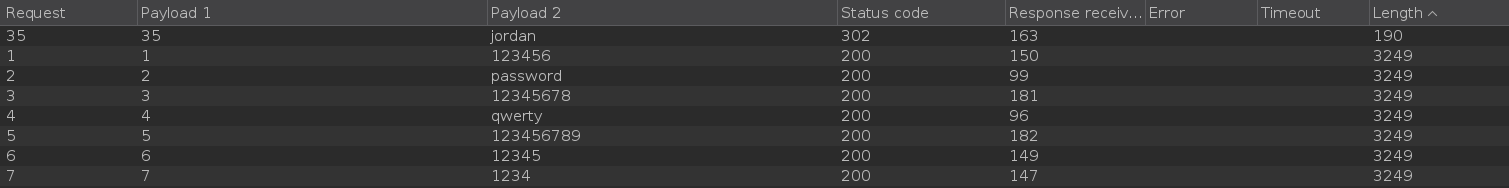 Iniciamos el ataque y vemos que hay un diferencia entre el Length de las diferentes peticiones, esto quiere decir que la contraseña es válida porque está devolviendo la longitud otra ruta de la web la cual tiene devuelve una longitud diferentes