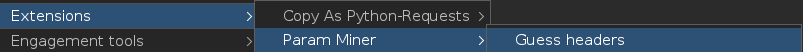 Lo siguiente que debemos hacer en instalar la extensión de Burpsuite llamada Param Miner https://portswigger.net/bappstore/17d2949a985c4b7ca092728dba871943. Una vez capturada la petición hacemos click derecho sobre ella y se nos abrirá este menú, en este caso como solo queremos probar cabeceras señalamos la opción Extensions > Param Miner > Guess headers