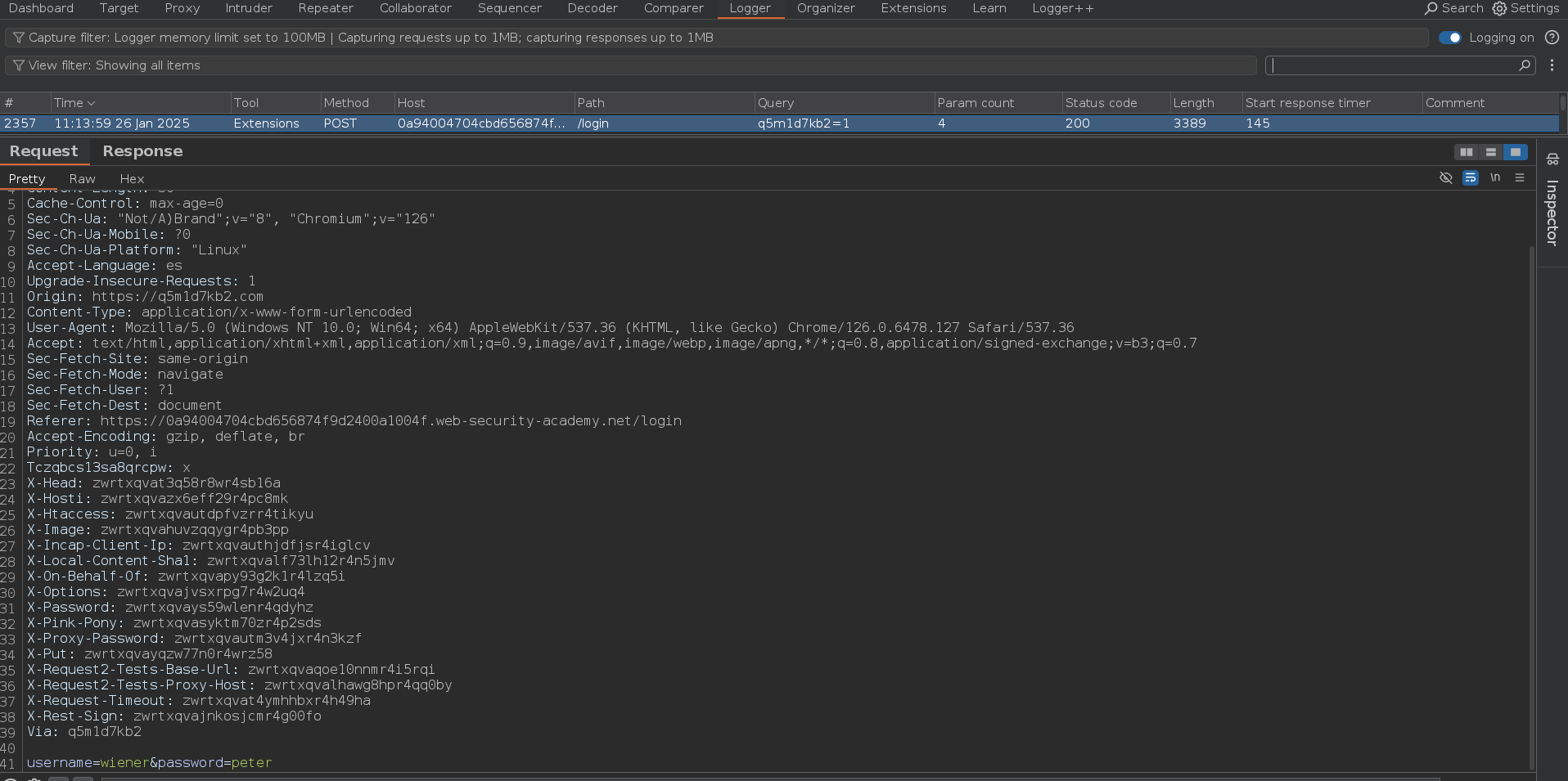 Si accedemos al Logger veremos que se están enviando payloads con diferentes cabeceras