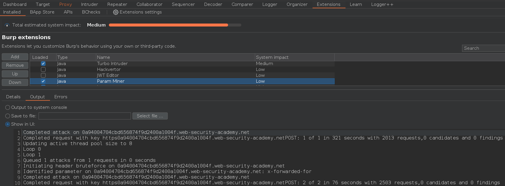 Para ver si Param Miner ha encontrado alguna cabecera disponible que podamos usar nosotros nos debemos dirigir a Extensions > Param Miner > Output. En este caso vemos que la cabecera X-Forwarded-For es válida