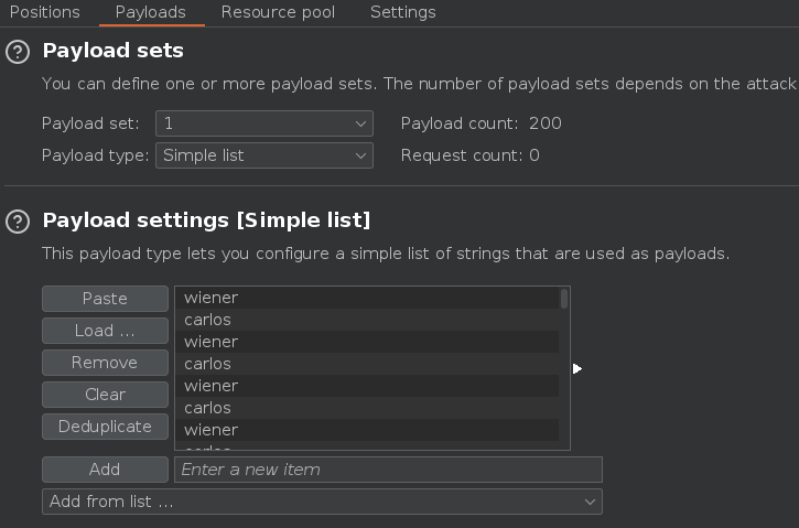 Una vez hecho esto con este script de python vamos a insertar 100 veces los nombres de usuario wiener y carlos en un diccionario