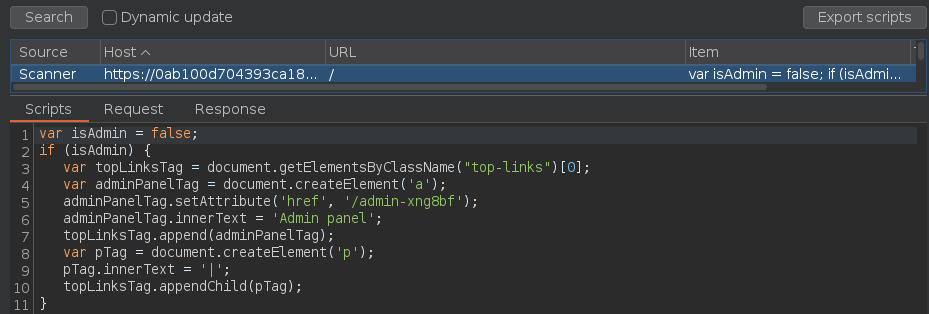 Nos dirigimos a Burpsuite, pulsamos en Target > Site map, señalamos el dominio a analizar y hacemos click izquierdo > Engagement tools > Find scripts para analizar los scripts del sitio web. Este script nos muestra un Admin panel que se aloja en /admin-xng8bf