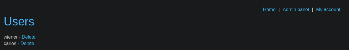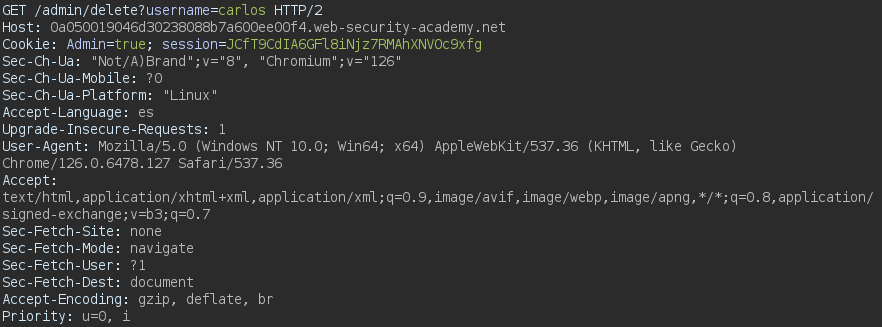Si pulsamos sobre Delete nos llevará a https://0a050019046d30238088b7a600ee00f4.web-security-academy.net/admin/delete?username=carlos pero no se eliminará el usuario. Para que el usuario se elimine debemos hacer la petición desde Burpsuite con el parámetro Admin=True