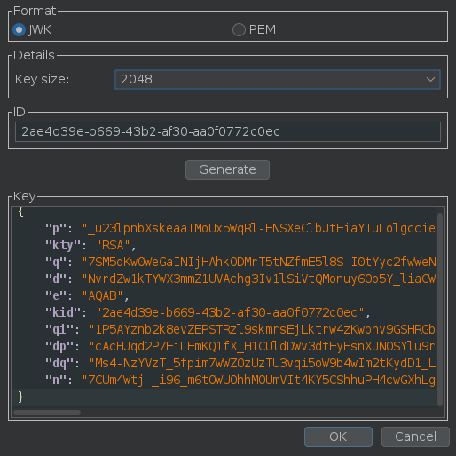 Sin embargo, los servidores mal configurados a veces aceptan cualquier clave incrustada en el parámetro jwk. Podemos explotar este comportamiento firmando un JWT modificado utilizando nuestra propia clave privada RSA y luego incrustando la clave pública correspondiente en la cabecera jwk. Para hacer esto, nos dirigimos al Burpsuite, hacemos click sobre JWT Editor y pulsamos sobre New RSA Key para generar una nueva clave RSA