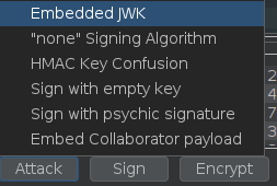 Nos dirigimos al repeater pulsamos en Attack y pulsamos sobre Embedded JWK, de esta forma Burpsuite extrae la clave pública de la clave RSA y la inyecta en el parámetro jwk