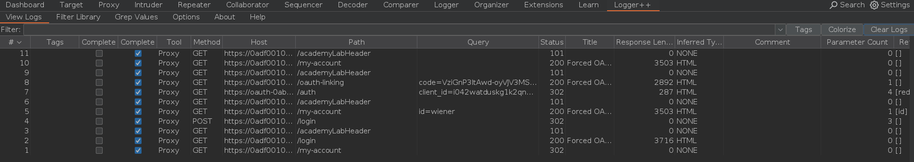 Si nos dirigimos a la extensión Logger ++ de Burpsuite vemos todo el flujo de peticiones