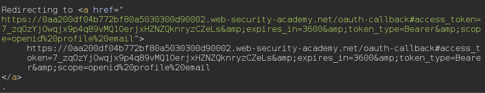 Sin embargo, si efectuamos el path traversal nos redirige a https://0aa200df04b772bf80a5030300d90002.web-security-academy.net/#access_token=VS0YNG681SR-PwP8nn2hBp5ptfo8KmfunnG3Qpq1C9W&expires_in=3600&token_type=Bearer&scope=openid%20profile%20email