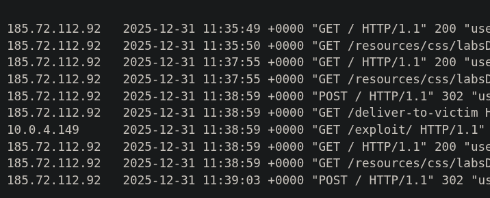 Pulsamos en Deliver exploit to victim, miramos el Access log y vemos que la víctima ha pulsado sobre el enlace que le hemos pasado