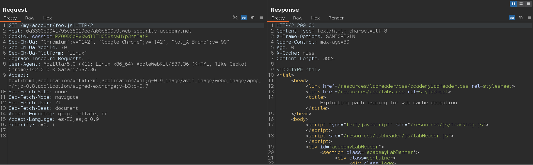 El siguiente paso es comprobar si la caché mapea la ruta de la URL a los recursos, es decir, tenemos que comprobar si la caché toma toda la ruta como válida, aunque incluya subrutas o extensiones que no existen realmente en el backend . Si añadimos alguna de las extensiones .js, .css o .svg, el recurso /my-account se almacena en la caché. Esto lo podemos saber gracias a las cabeceras X-Cache: miss, Cache-Control: max-age=30 y Age: 1
