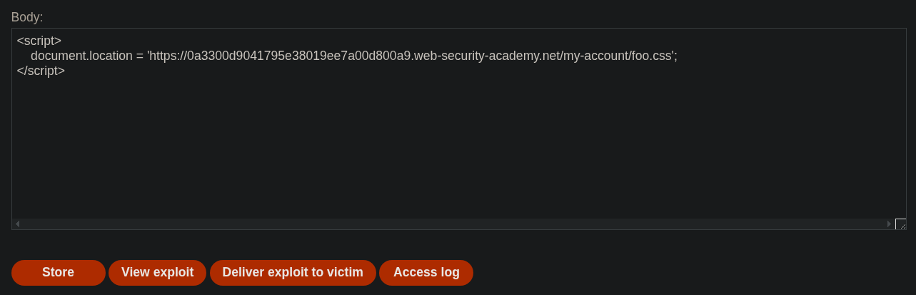 Podemos aprovecharnos de esta vulnerabilidad para obtener la API KEY del usuario carlos. Para ello, nos vamos al Exploit Server y creamos un payload que redirija al usuario a la ruta /my-account/foo.css para que se cachee su API KEY. Debemos asegurarnos de que cada petición que enviemos tenga una clave caché diferente, para ello, es recomendable usar un cache buster, aunque también podemos usar una nueva extensión de archivo o mantener la extensión de archivo pero cambiarle el nombre. En este caso voy a usar una nueva extensión de archivo