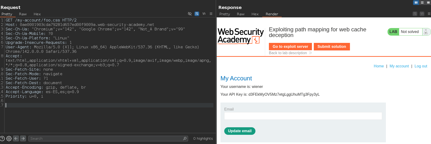 El siguiente paso para ver si funciona es eliminar nuestra cookie de sesión y hacer una petición a https://0ae0001903cda79281d657ed00f9009a.web-security-academy.net/my-account/foo.css para ver si se ha cacheado correctamente. Como podemos ver, es posible visualizar nuestra API KEY sin necesitar estar logueados, debido a que la petición se ha cacheado correctamente