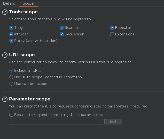 En la pestaña de Scope marcamos la casilla Proxy (use with caution) y seleccionamos Include all URLs